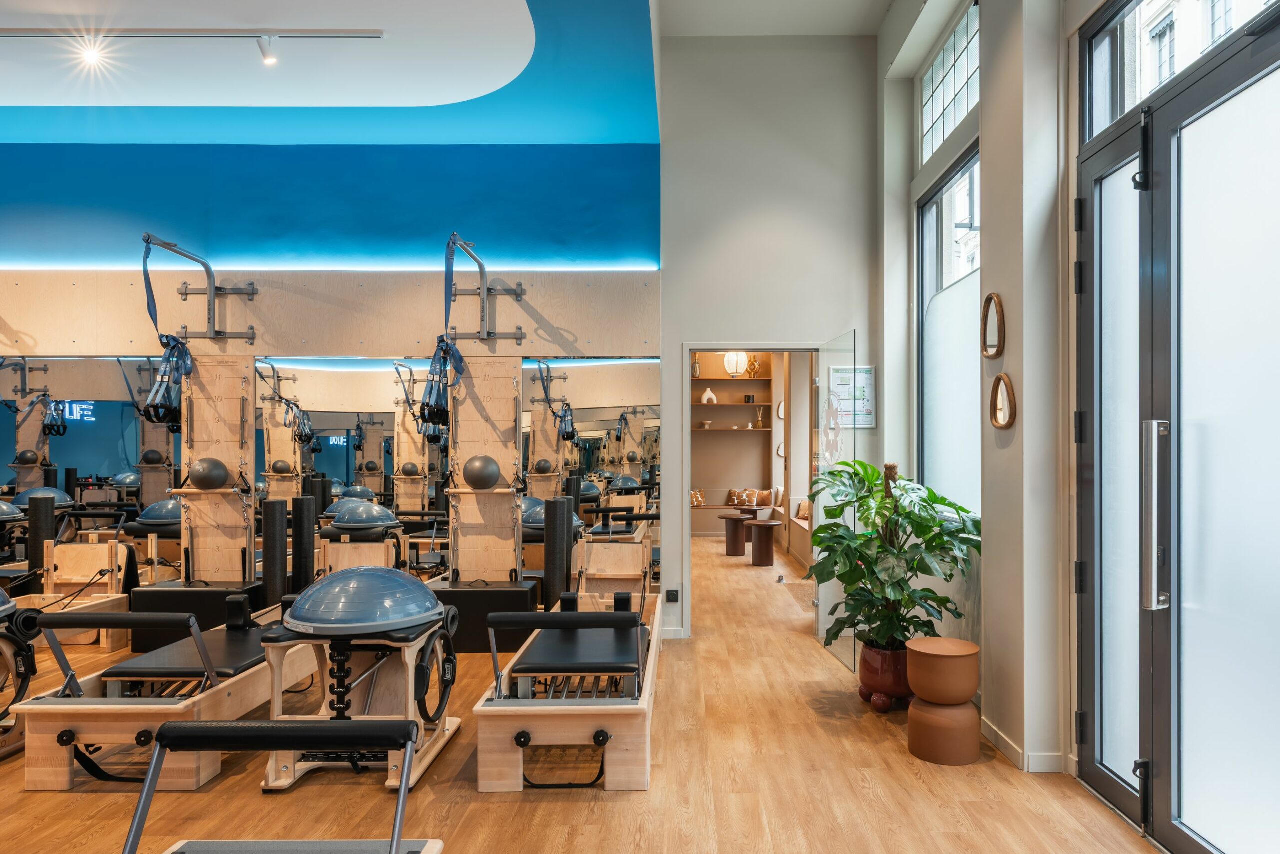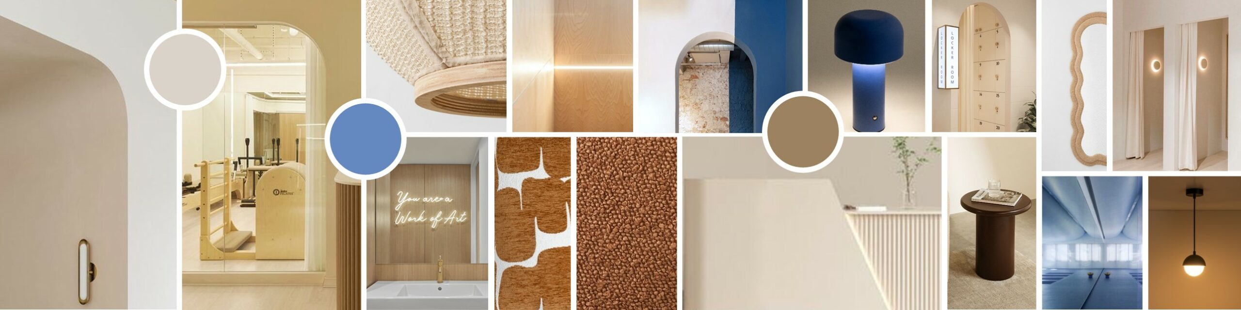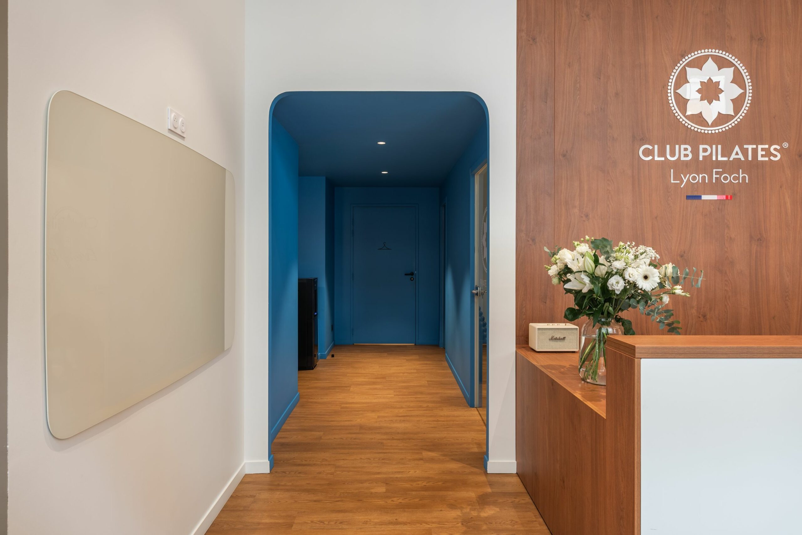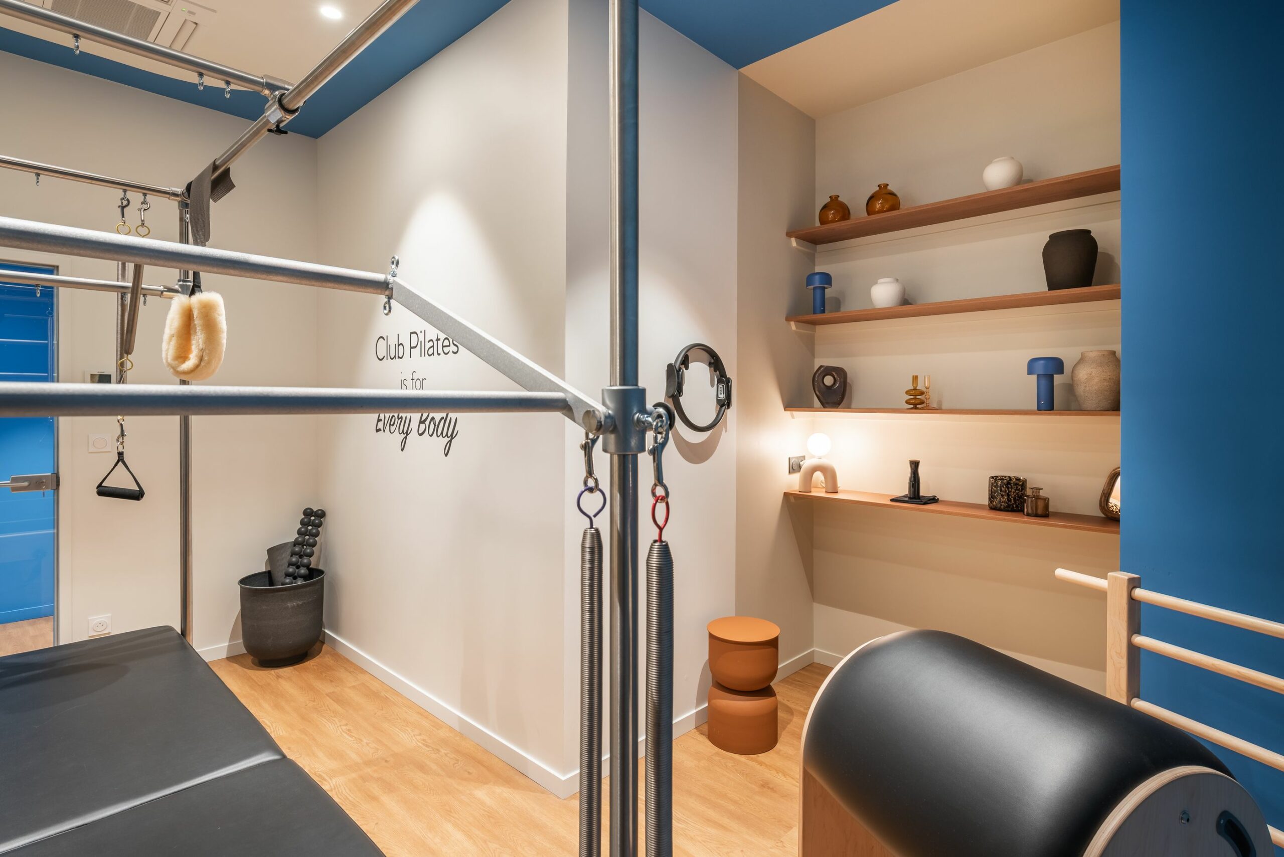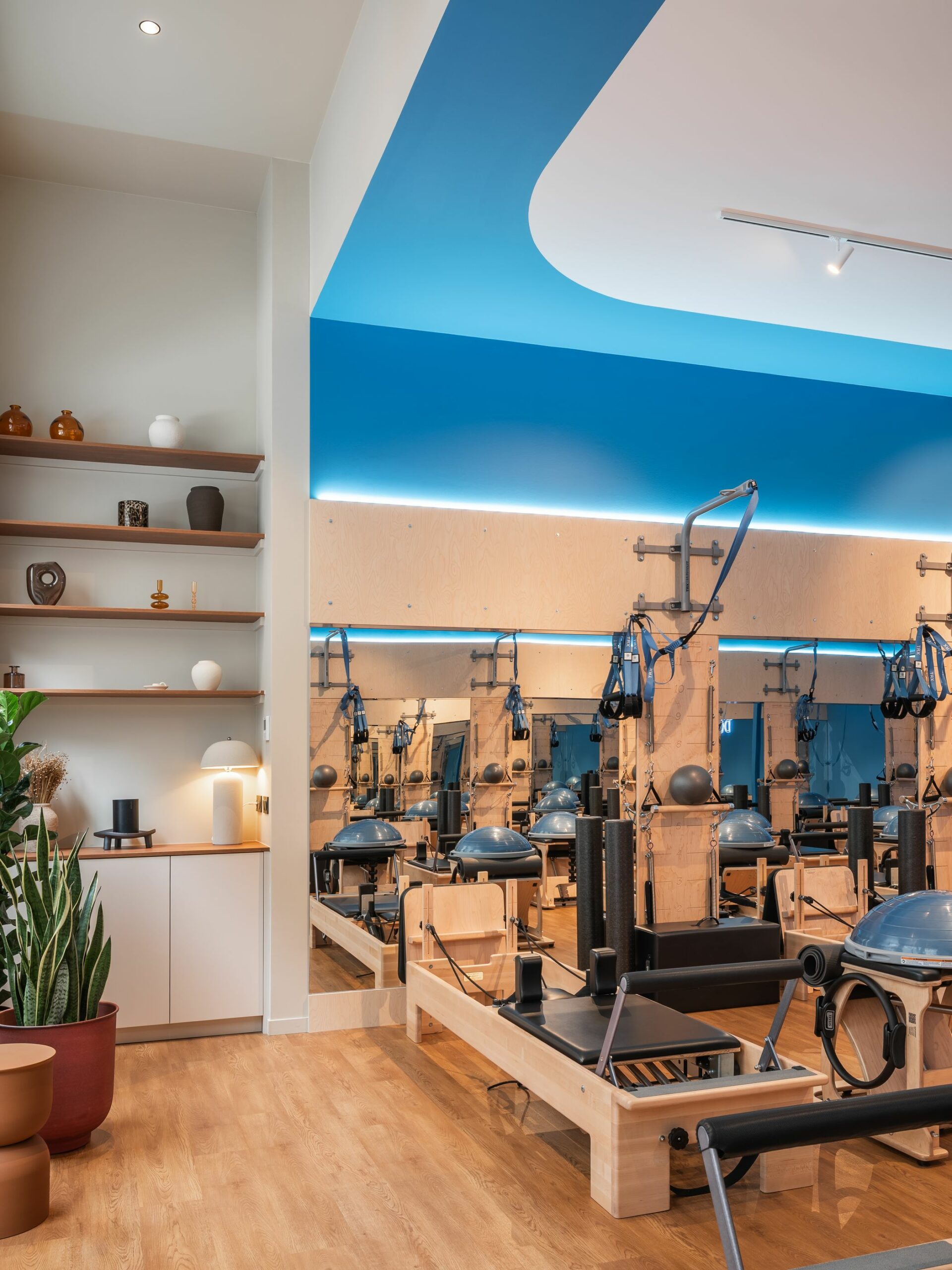 Le projet organise les espaces autour d’un parcours simple et lisible. L’entrée s’ouvre sur l’accueil, un salon associé à un corner de vente. La circulation mène naturellement vers la salle de classe équipée de reformers, puis vers la salle d’entraînement individuel et les vestiaires. Chaque espace est identifiable par un traitement spécifique des matières, des couleurs et de la lumière, créant des ambiances distinctes et cohérentes. Les circulations intègrent des fonctions complémentaires comme rangement, affichage et fontaine à eau, pour guider le visiteur de manière logique et intuitive. La mezzanine existante a été conservée pour des usages privés.