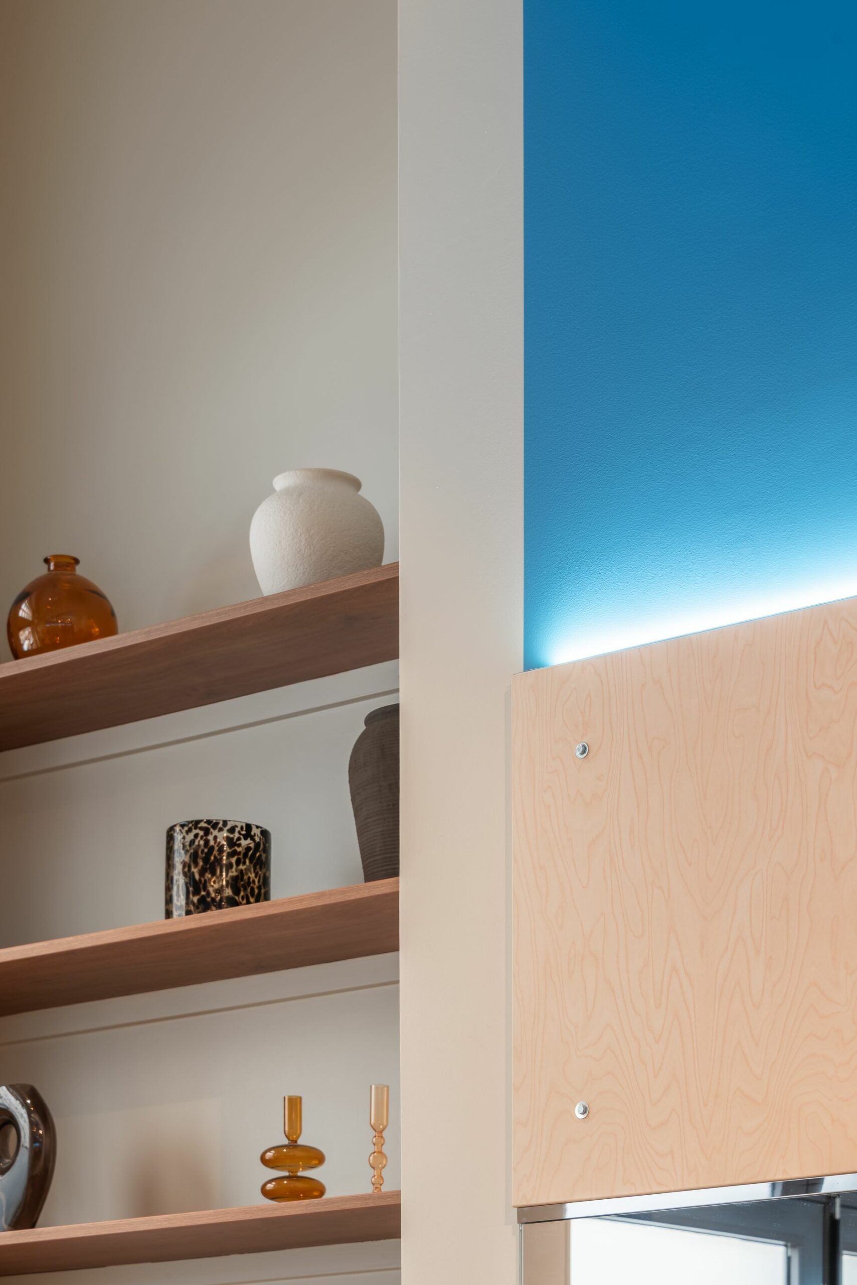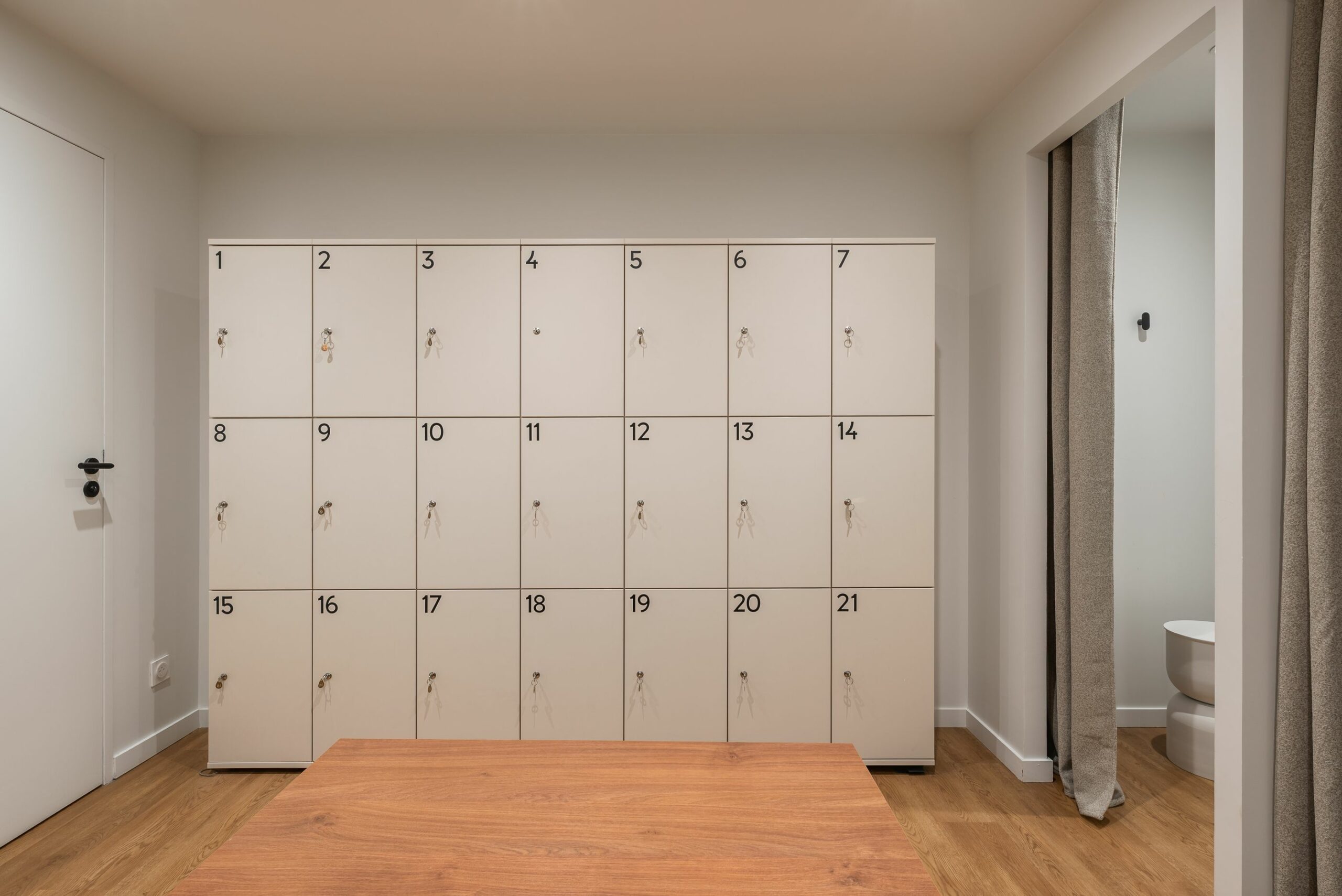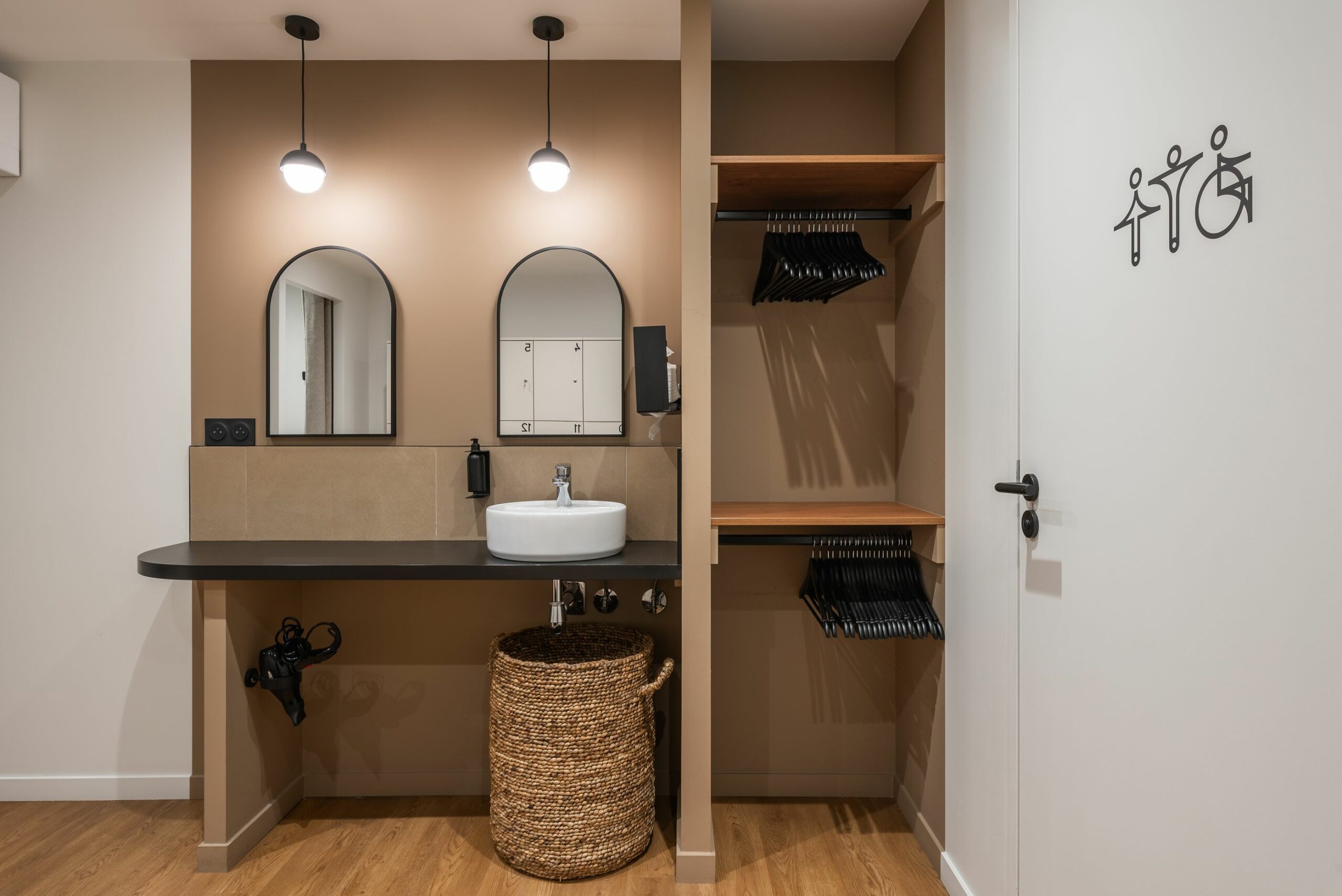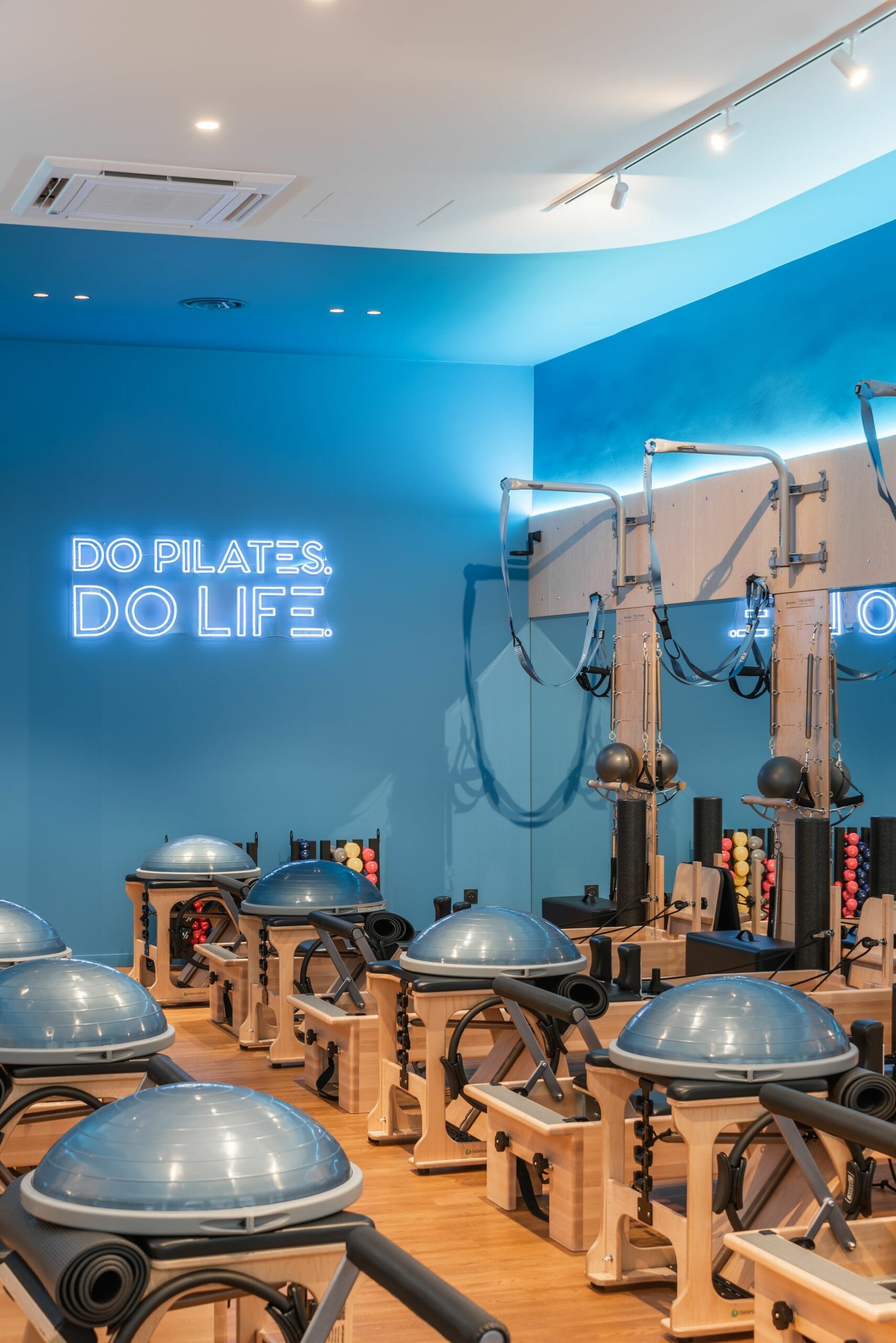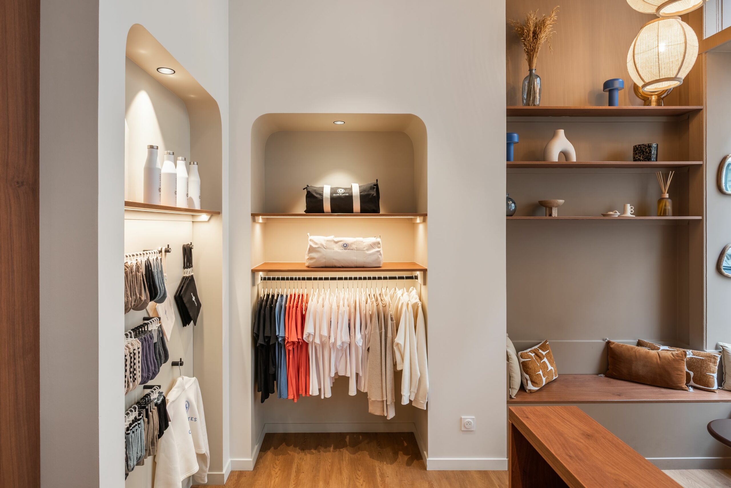 Le projet organise les espaces autour d’un parcours simple et lisible. L’entrée s’ouvre sur l’accueil, un salon associé à un corner de vente. La circulation mène naturellement vers la salle de classe équipée de reformers, puis vers la salle d’entraînement individuel et les vestiaires. Chaque espace est identifiable par un traitement spécifique des matières, des couleurs et de la lumière, créant des ambiances distinctes et cohérentes. Les circulations intègrent des fonctions complémentaires comme rangement, affichage et fontaine à eau, pour guider le visiteur de manière logique et intuitive. La mezzanine existante a été conservée pour des usages privés.