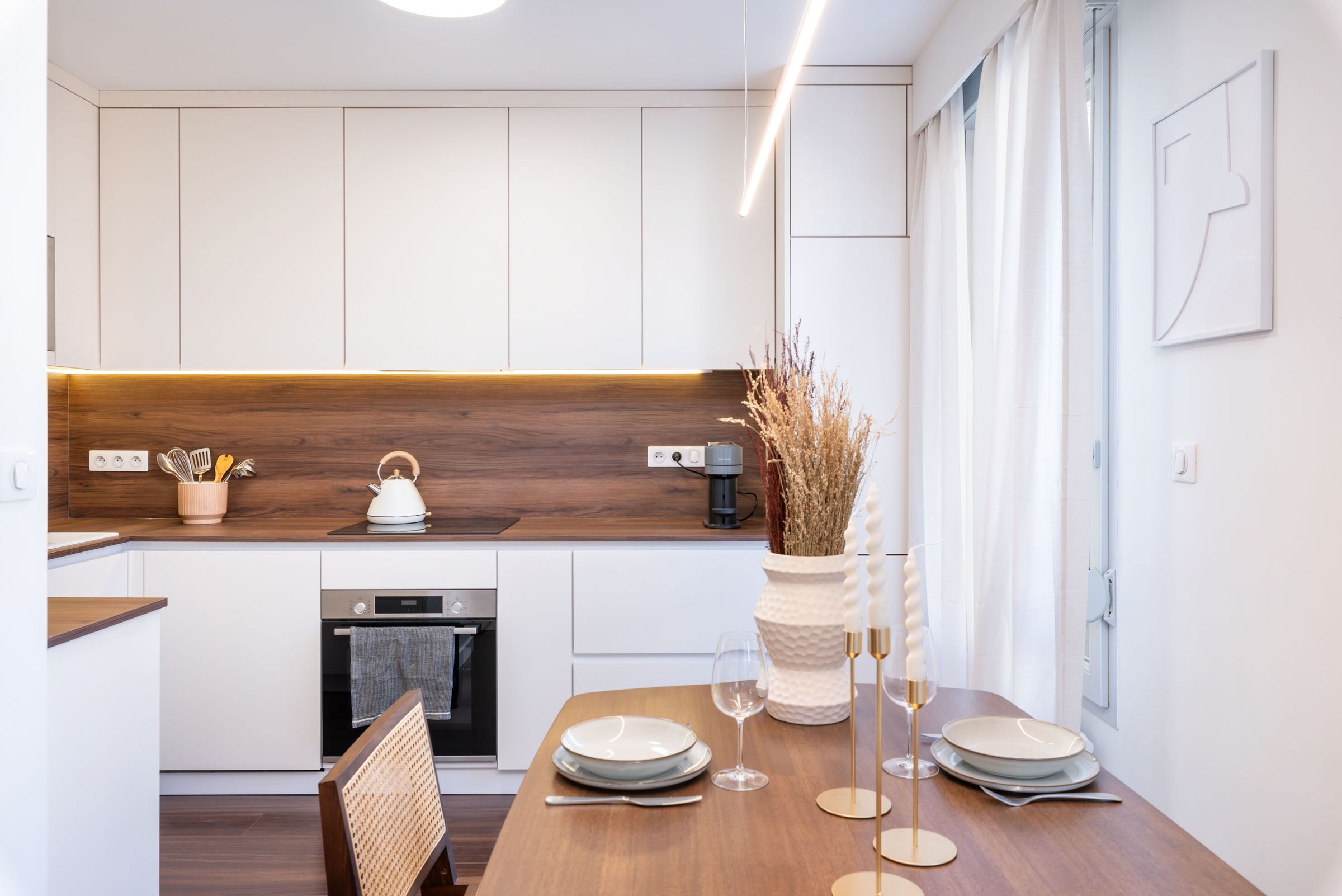 La cuisine, entièrement repensée, allie fonctionnalité et modernité. Spacieuse et ouverte sur le salon, elle est entièrement équipée et pensée pour convenir à tous les usages, offrant un espace de préparation agréable et convivial, à la fois contemporain et pratique au quotidien.
