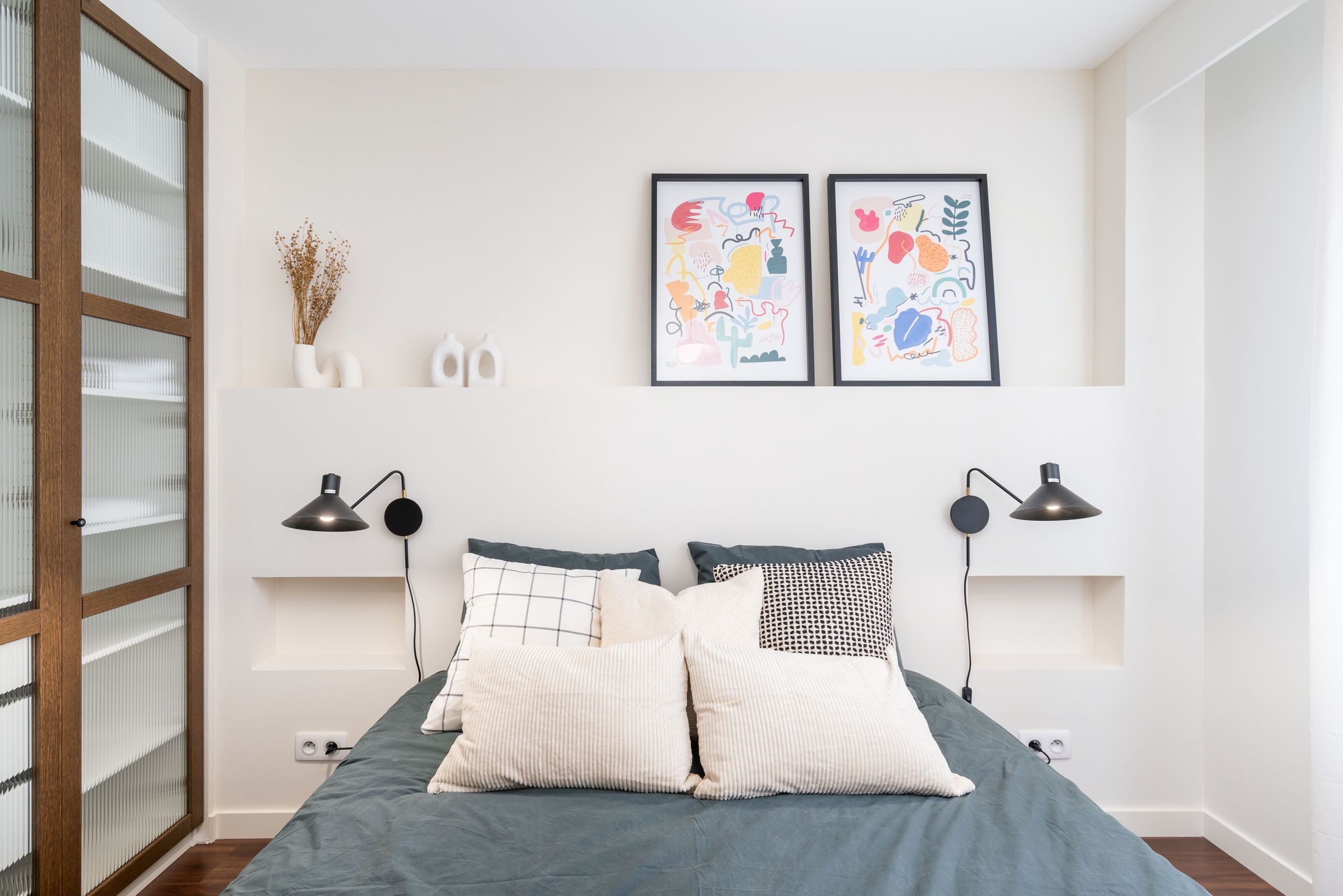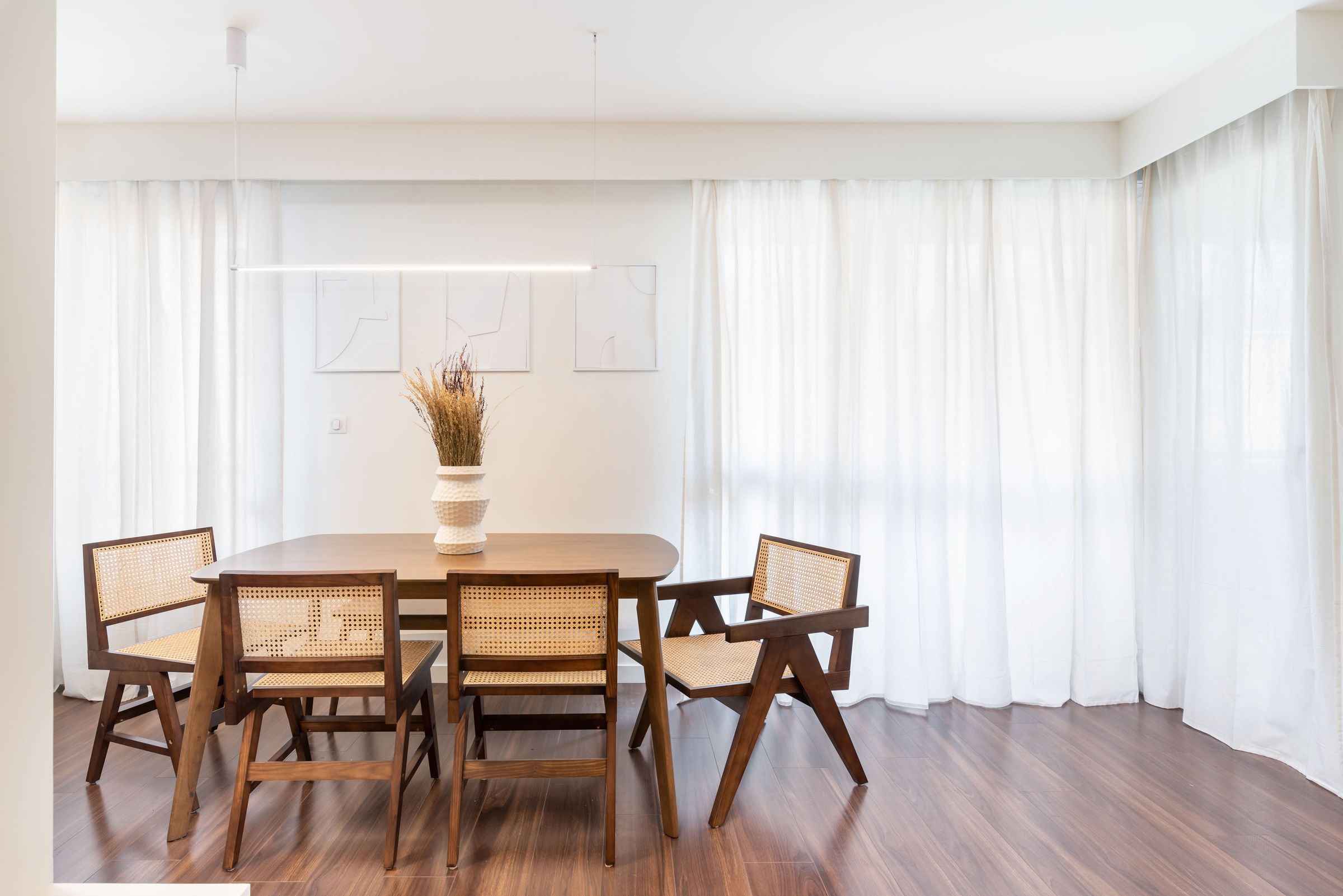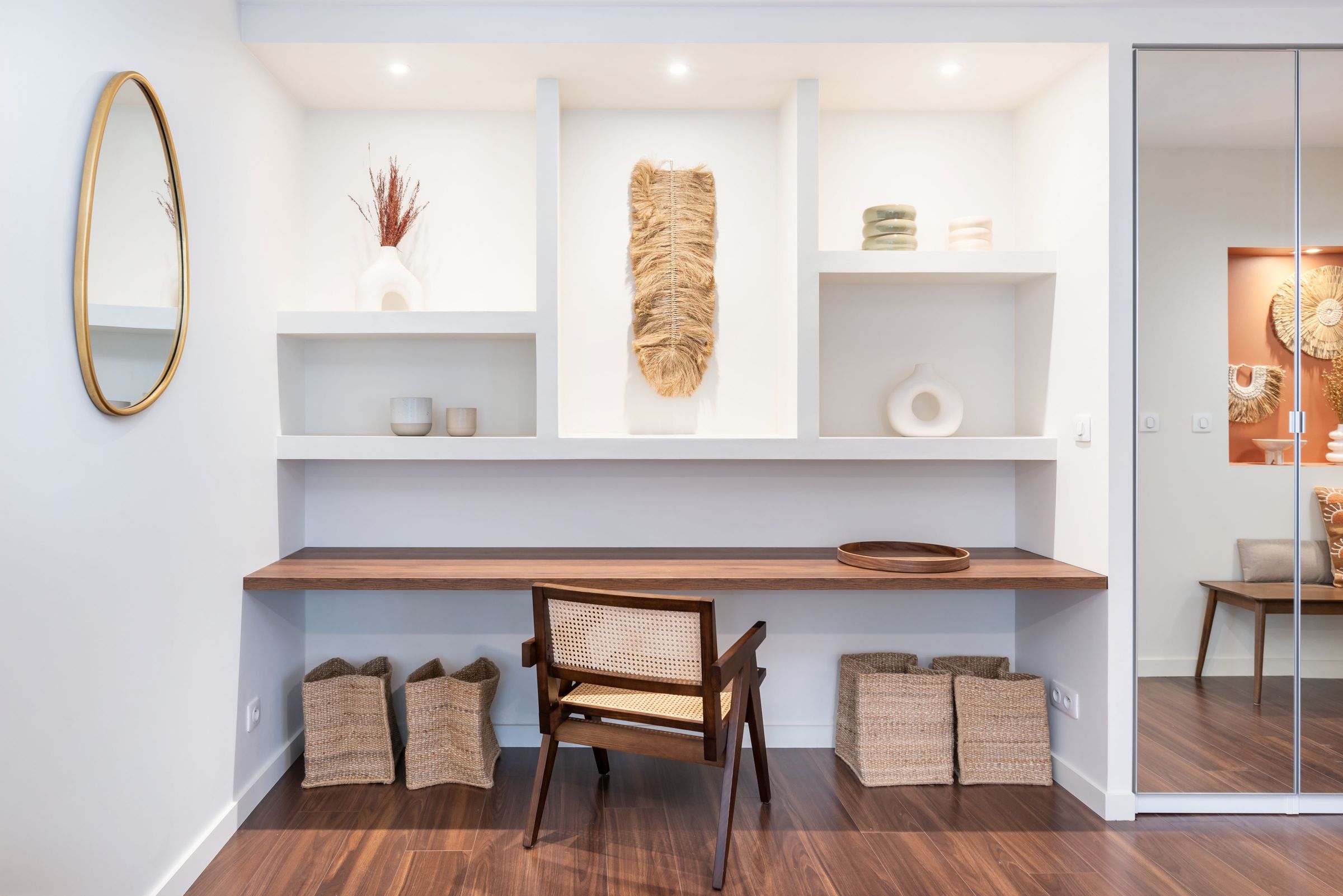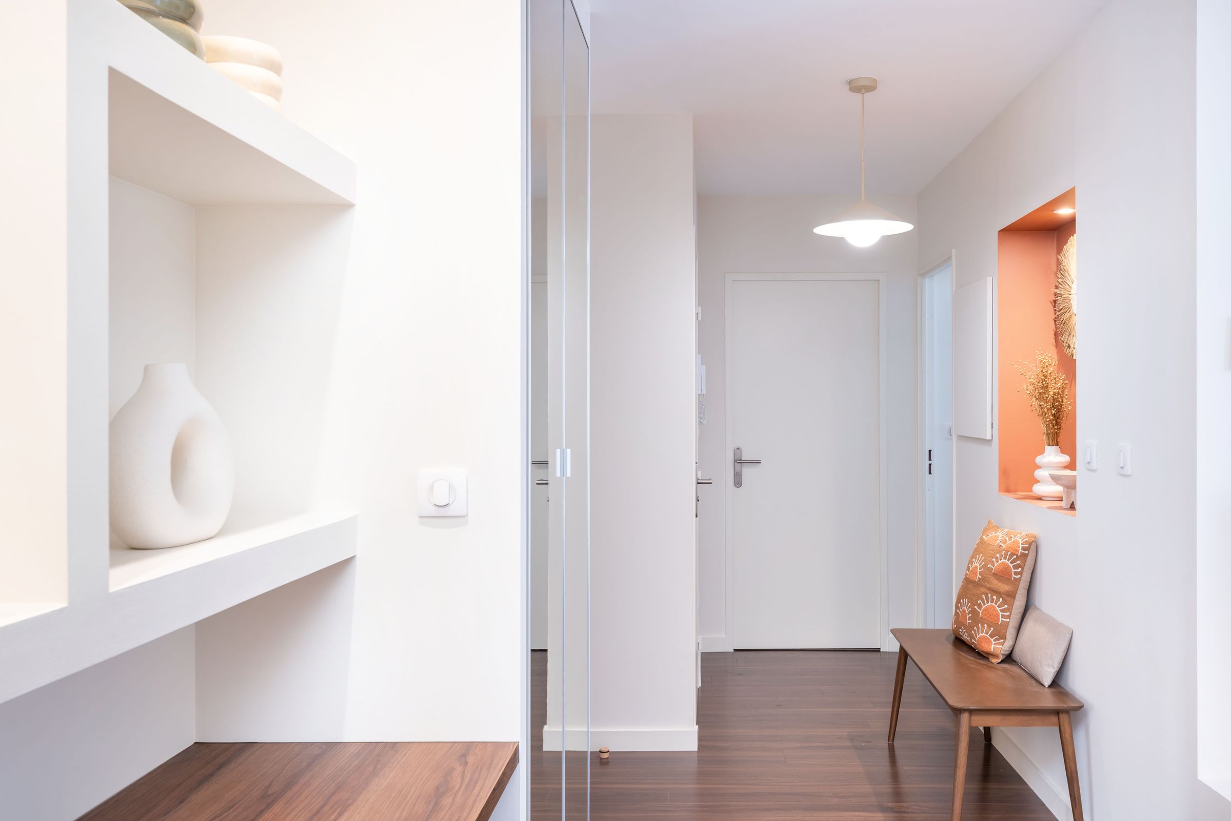 Pour optimiser les mètres carrés et mettre en valeur les volumes, l’appartement a été repensé avec un nouvel ordonnancement : la cloison entre salon et cuisine a été ouverte pour agrandir l’espace de vie, tandis que l’accès direct depuis l’entrée a été fermé pour mieux définir le hall. La chambre a été réaménagée avec dressing intégré, chevets et rideaux, et un espace bureau a été ajouté pour télétravail ou bibliothèque.