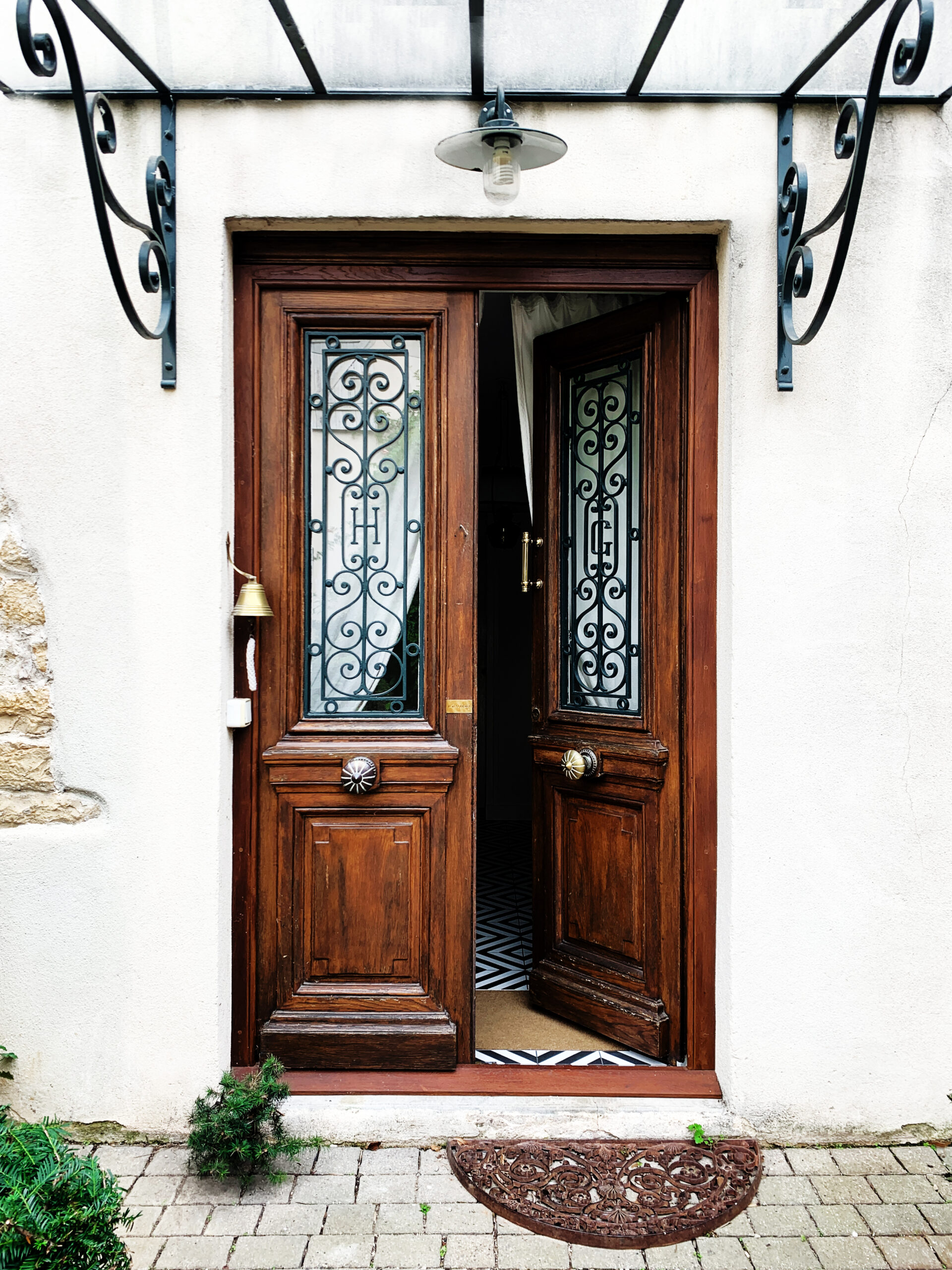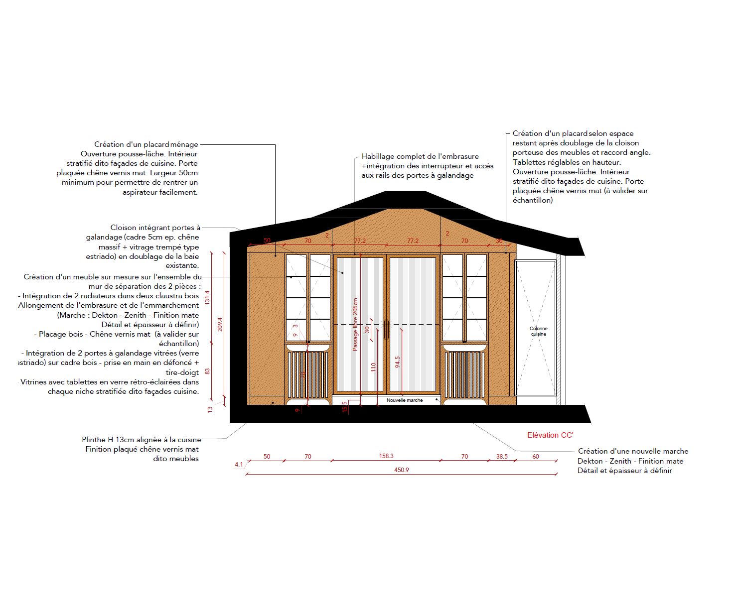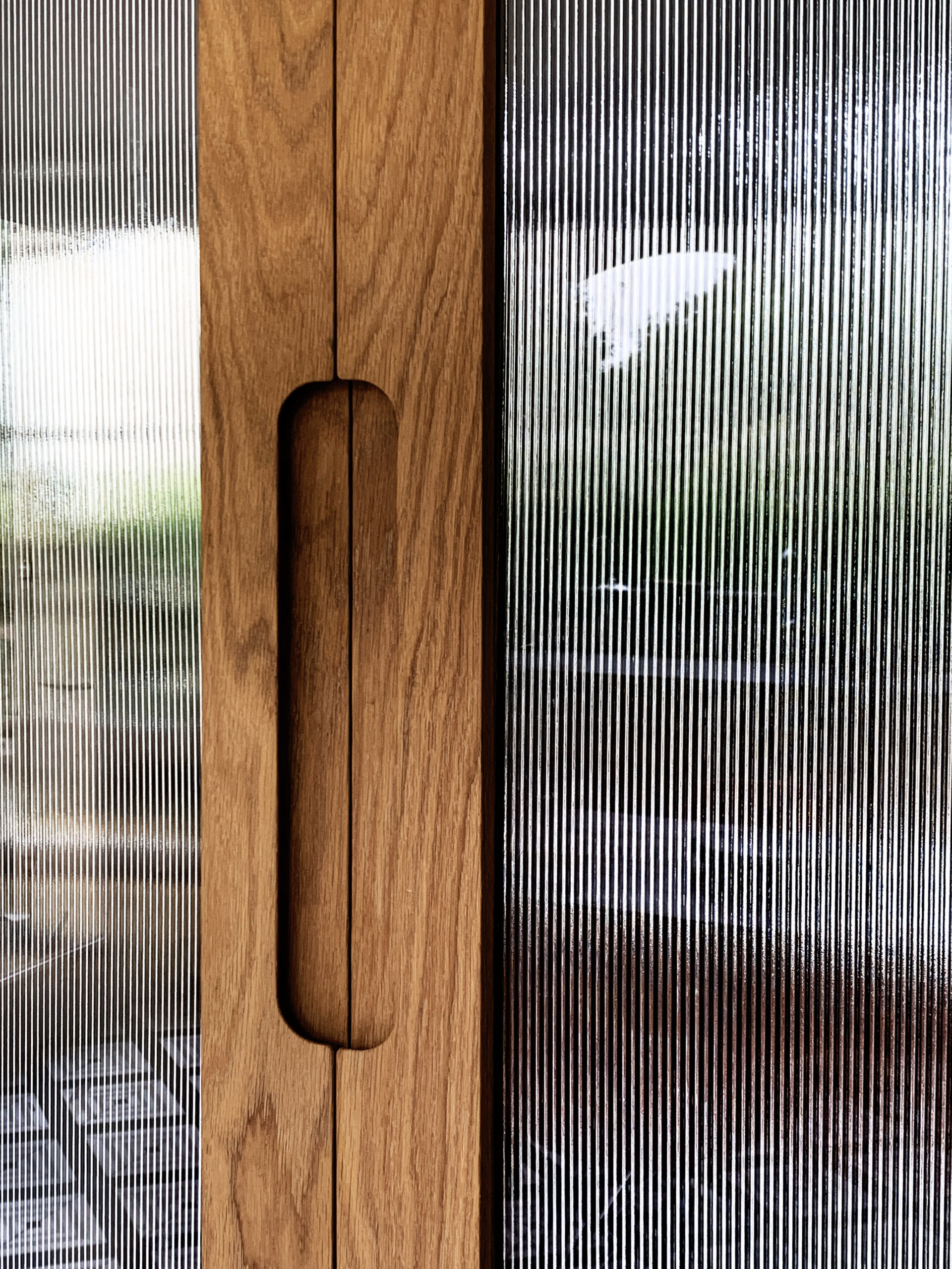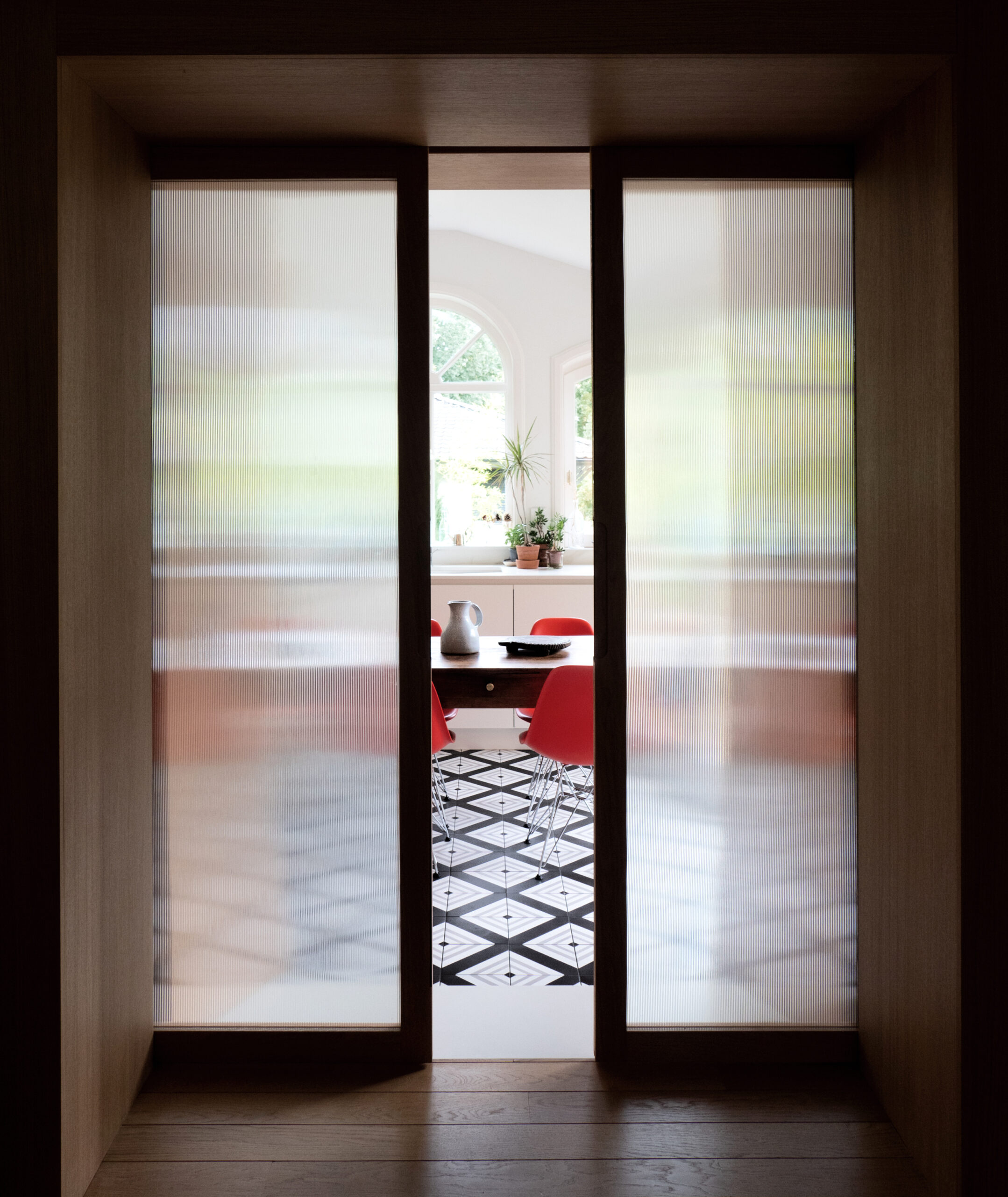 L’embrasure épaisse existante a été élargie et habillée pour accueillir de grandes portes coulissantes en galandage en bois massif et verre estriado translucide.