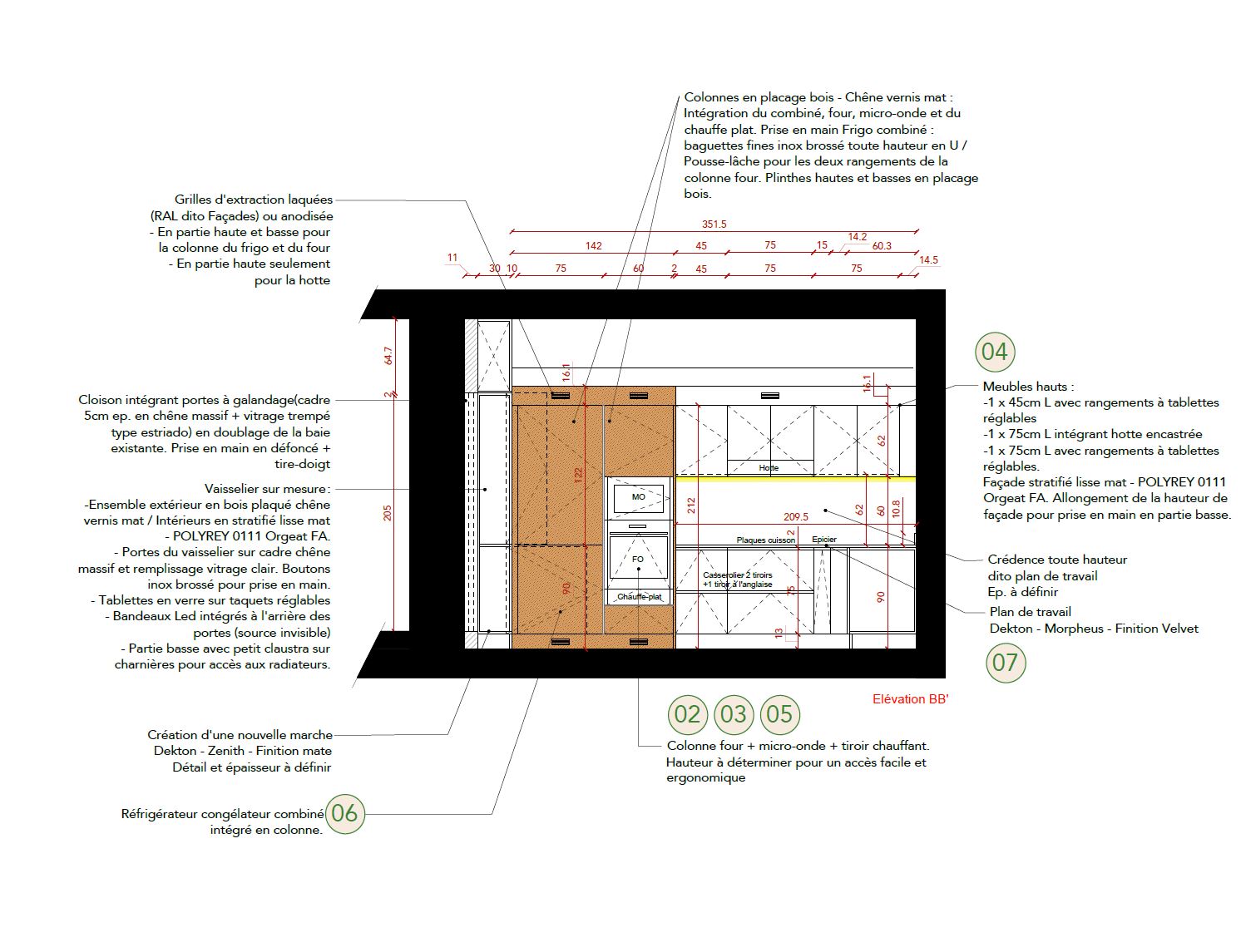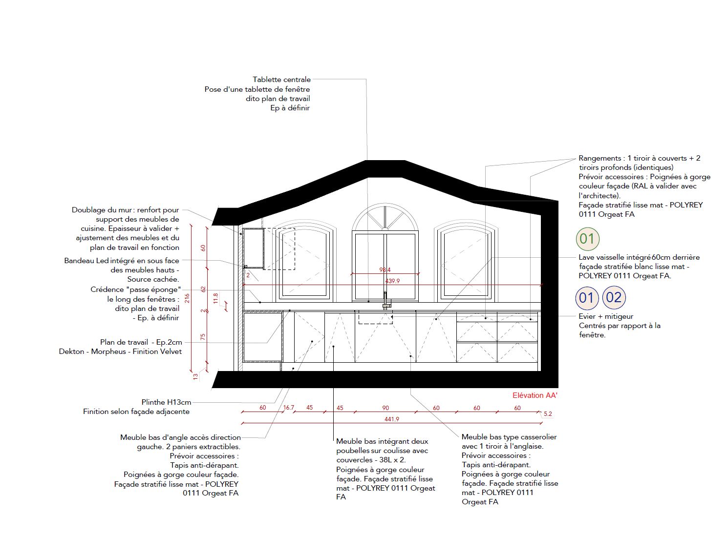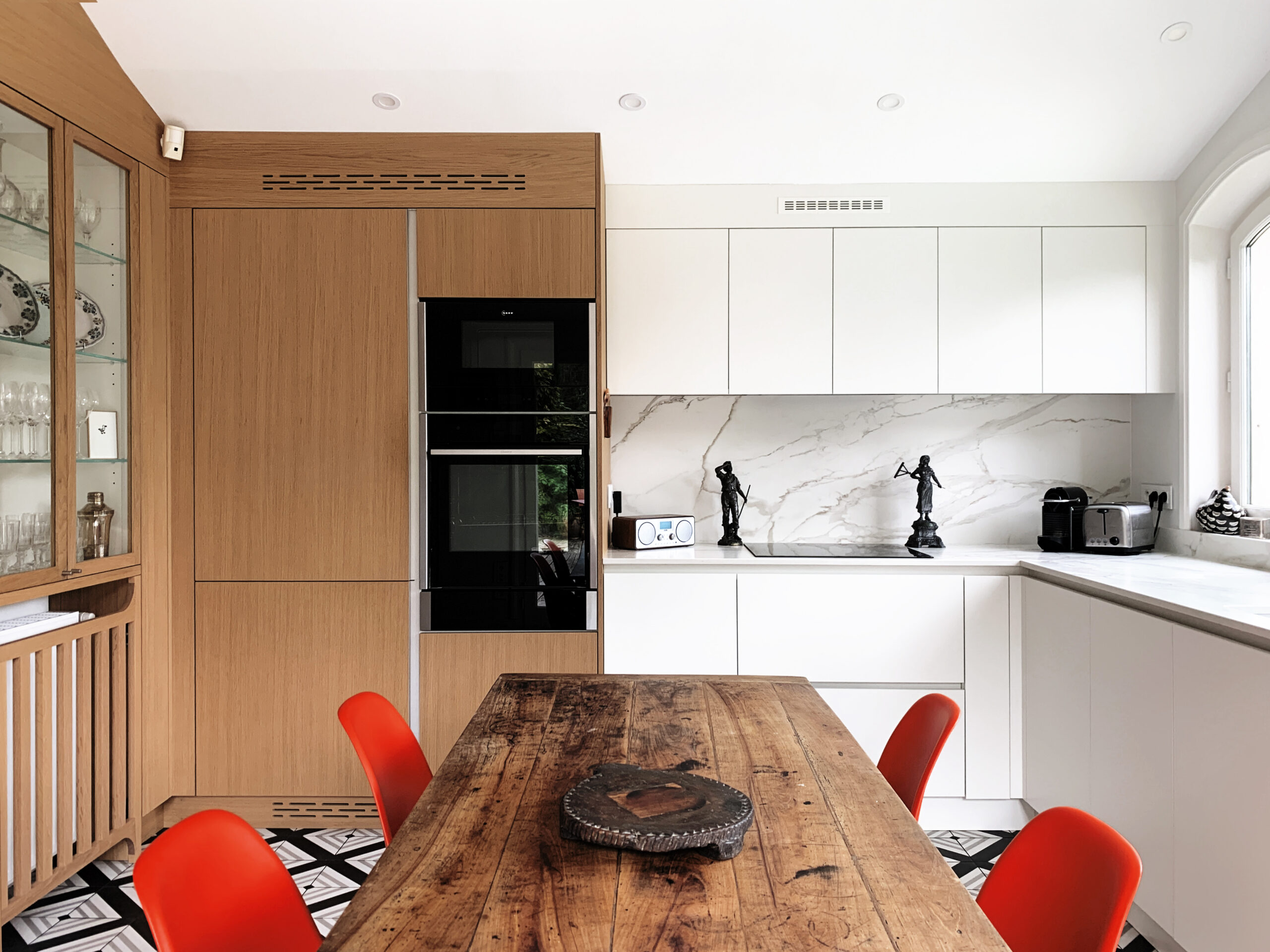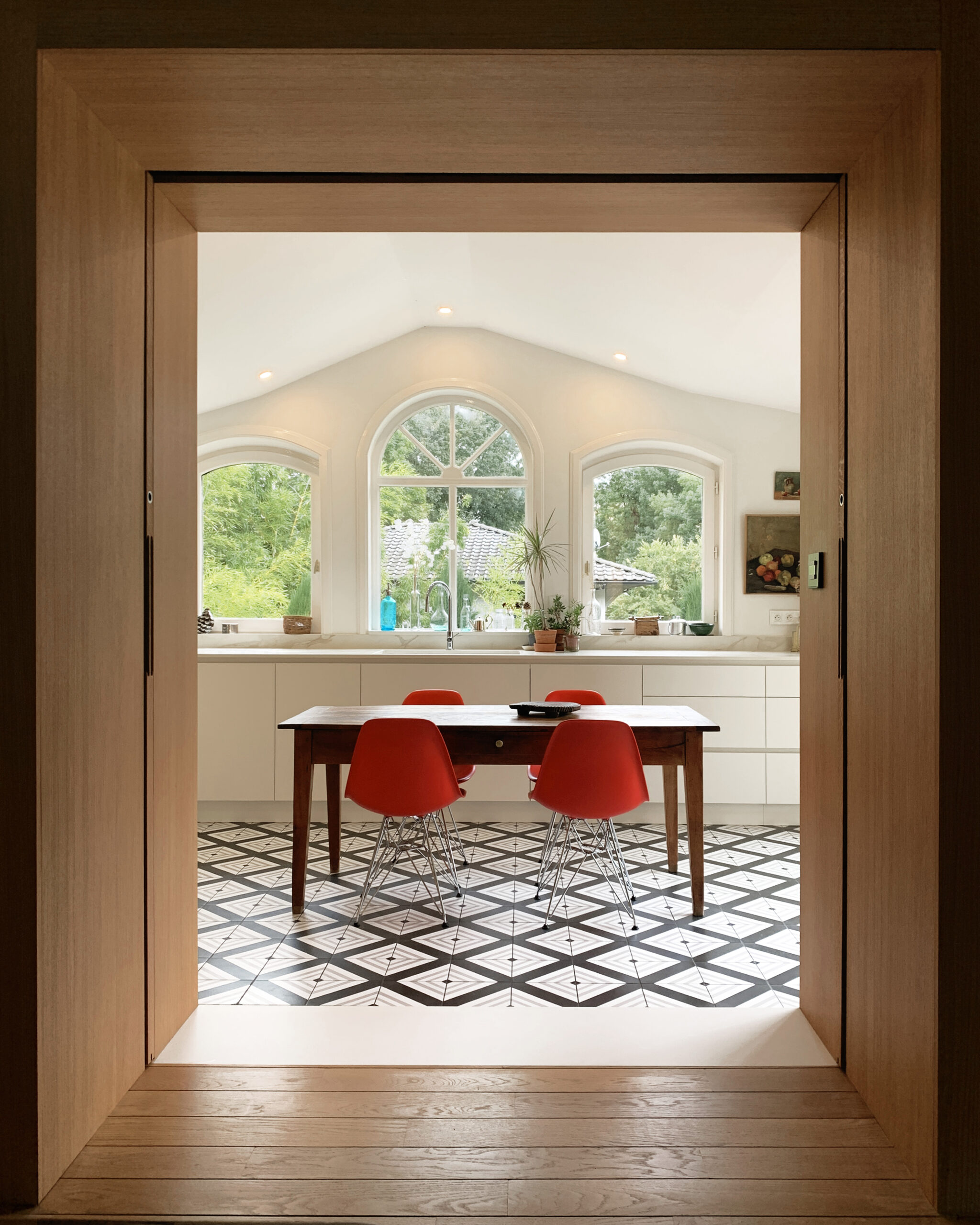 L’objectif de ce projet : offrir la possibilité de relier ou diviser la cuisine et la salle à manger selon le quotidien. Pensée comme un véritable cœur de maison et en totale transition avec l’extérieur, la cuisine mêle matériaux chaleureux et finitions contemporaines : bois, carreaux de ciment et plan de travail en Dekton s’associent pour créer une ambiance lumineuse, élégante et accueillante.