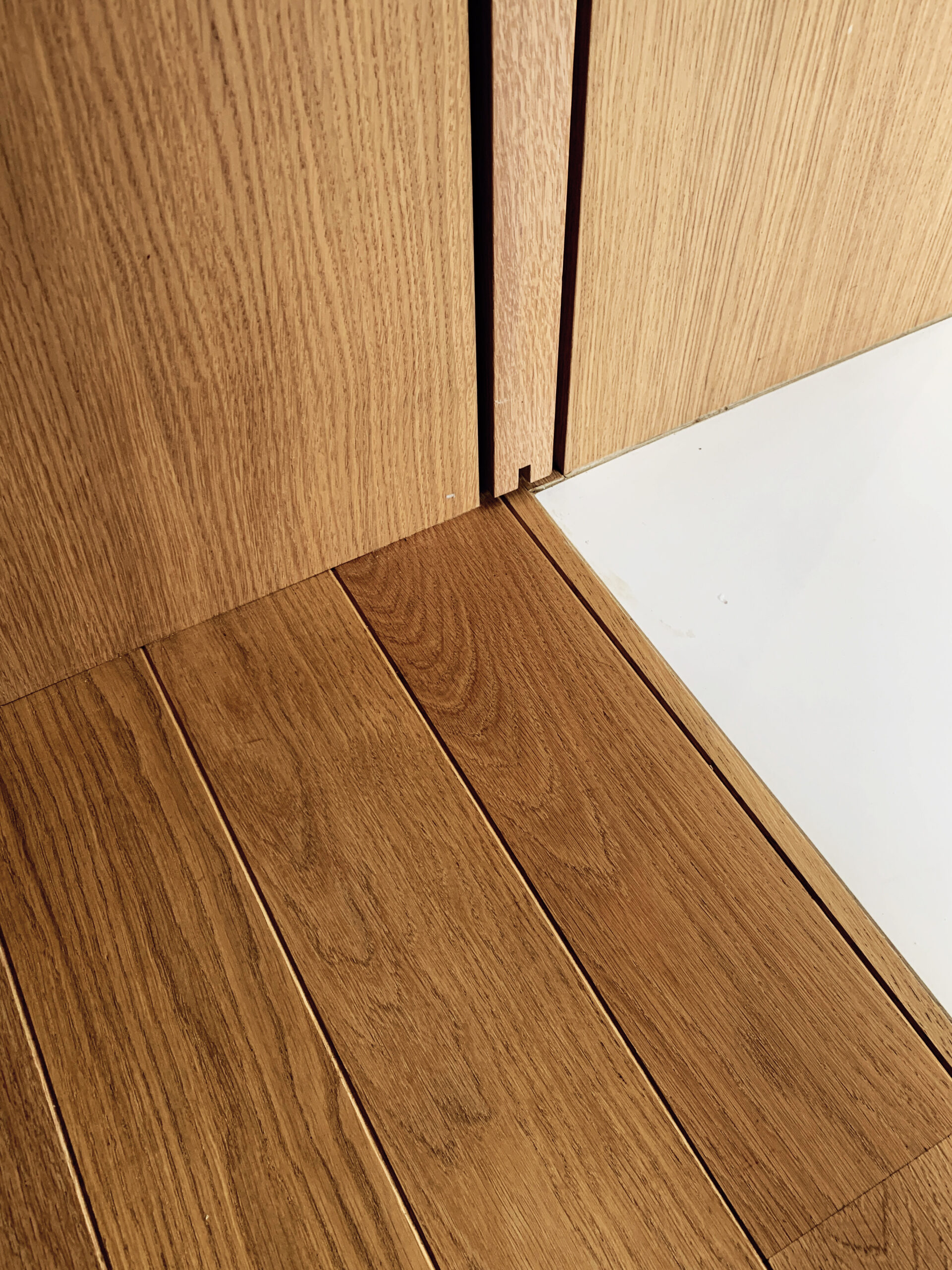 Le mur côté salle à manger a été conçu comme un prolongement en bois intégrant des vitrines rétro éclairées et dissimulant les radiateurs : un équilibre entre cachet et fonctionnalité.